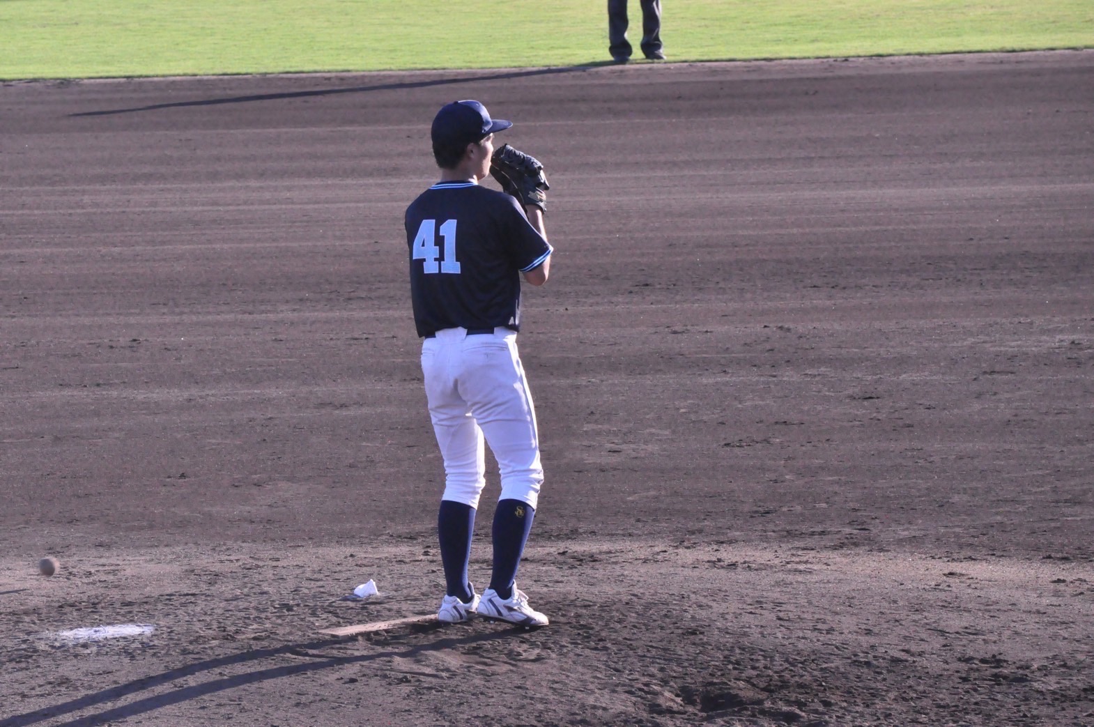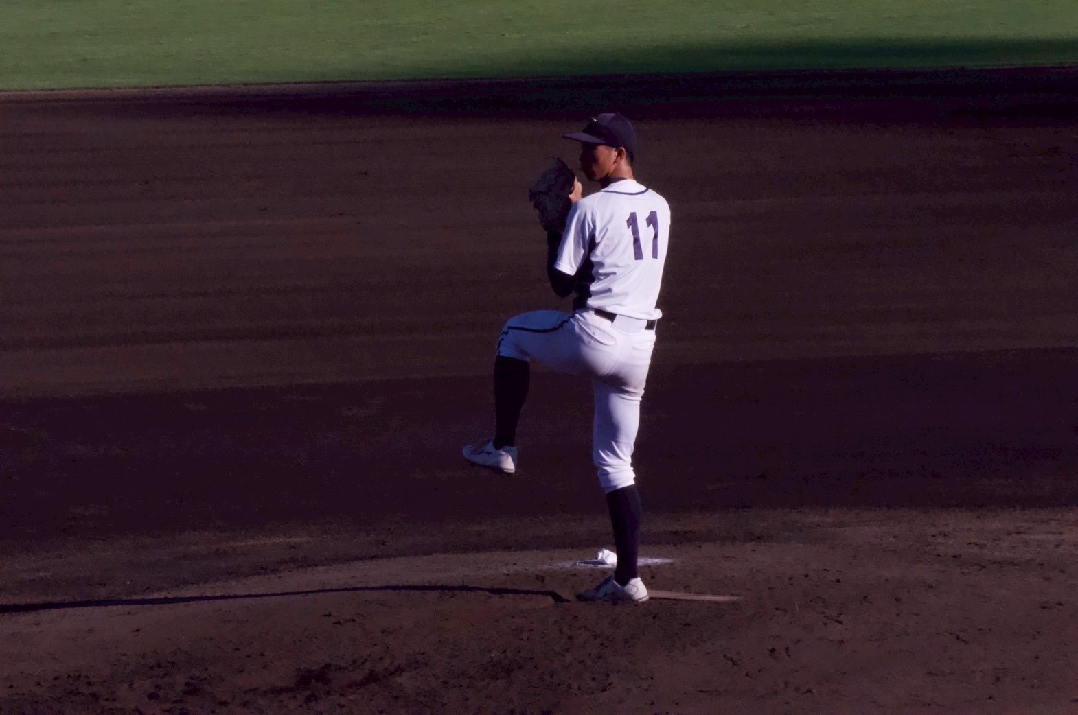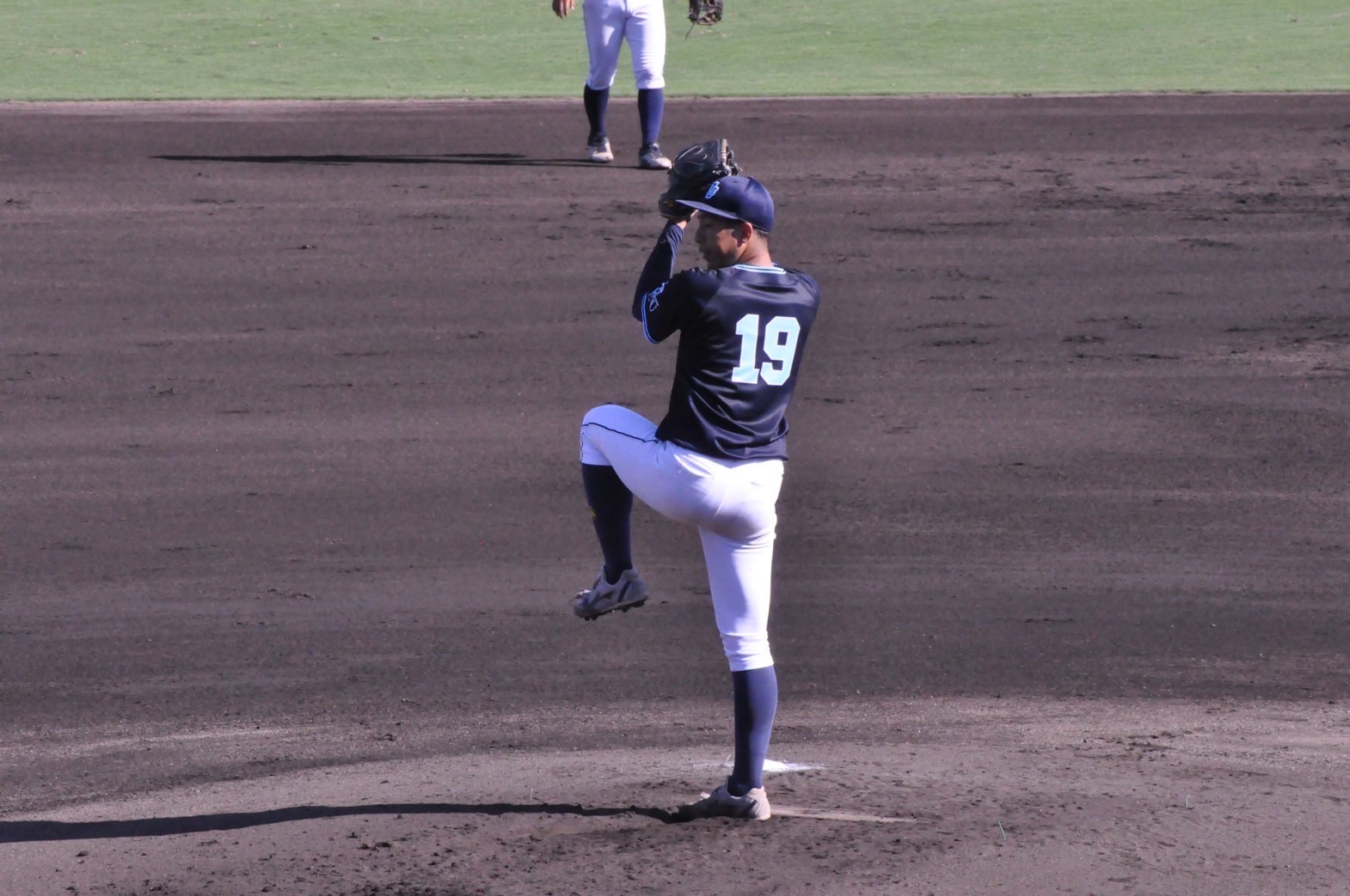 秋季リーグ戦第2週目、聖カ大と徳島大の第1試合がレクザムボールパーク丸亀で行われた。まずは2回表、聖カ大が西川(2年:北条)の四球と福岡(4年:伊予)の安打でチャンスを作ると、失策の間に2点を先制する。さらに聖カ大は3回表、大村(2年:松山聖陵)が安打を放ち出塁すると、暴投の間に1点を追加する。追いつきたい後攻、徳島大は3回裏、瀬尾(4年:彦根東)が四球により出塁すると、畑野(1年:東海大大阪仰星)が適時打を放ち2点差に詰め寄る。さらに5回裏、松岡(3年:海星)の二塁打で得点のチャンスを作るも、聖カ大先発の岩川(4年:東温)の前に無得点に終わる。聖カ大打線も、4回以降は徳島大先発の山添(3年:牧野)と後を受けた神戸(2年:城南)から得点を奪えず、スコアボードに0が並ぶ。2点差のまま迎えた9回裏、徳島大は聖カ大2番手の佐々木(1年:北宇和)から、西山(2年:柏原)が安打などで二死満塁の好機を作るが、最後は聖カ大3番手の高橋(3年:西条)に抑えられ無得点に終わった。徳島大は何度も反撃のチャンスを作ったものの、聖カ大が逃げ切り3-1で徳島大を下した。