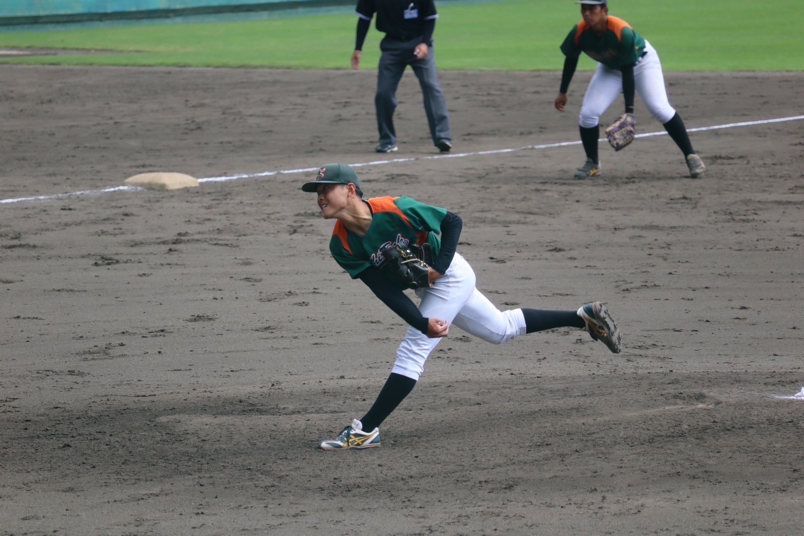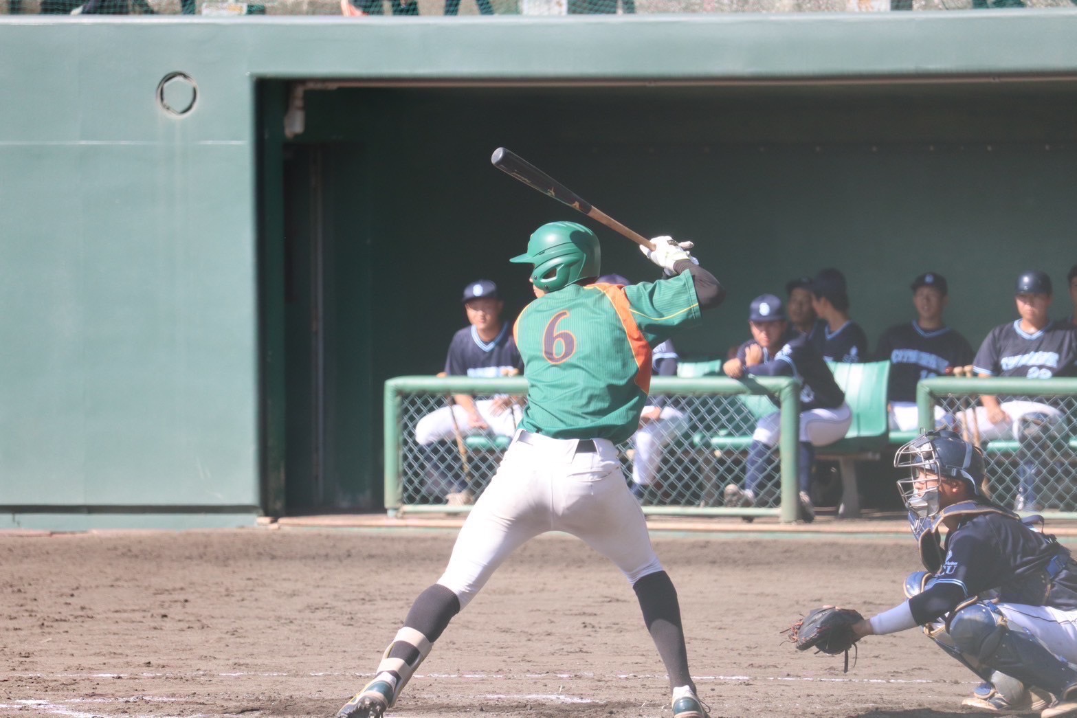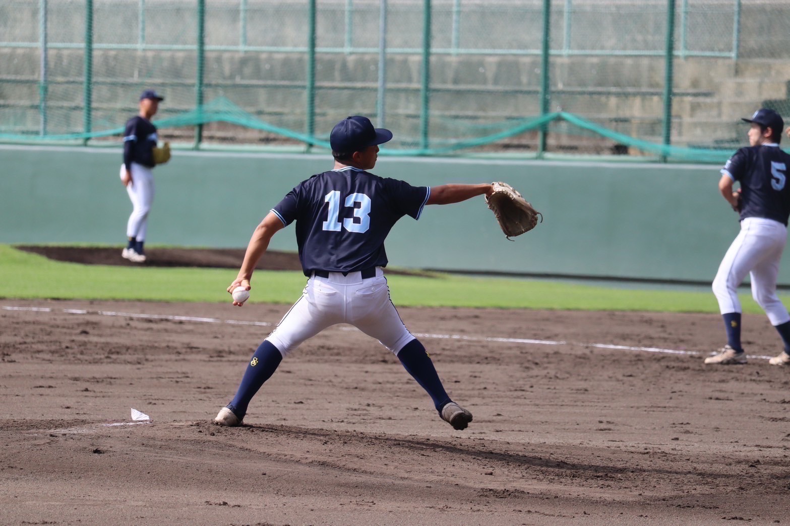秋季リーグ戦第4週、高工大と聖カ大の第2戦。開幕以降の勢いそのままに優勝に王手をかけた高工大と目の前での優勝は阻止したい聖カ大の一戦。高工大が序盤から試合を大きく動かす展開となった。1回裏、先頭の髙岡(4年:大手前高松)が内野安打で出塁すると、舩見(1年:明豊)のレフト前ヒット、原(4年:明豊)の四球で二死満塁となる。松岡(2年:唐津西)、打越の連続適時二塁打などで5点先制する。2回からマウンドに上がり、高工大を抑えていた聖カ大の宇都宮(1年:松山工業)。しかし、5回裏、打越(4年:相生)が内野安打で出塁すると、髙岡のセンター前ヒットで一点を追加。反撃したい聖カ大だったが、高工大の先発飯田(3年:広陵)が9回無失点10奪三振の好投。序盤に得点をし、聖カ大を無失点に抑えた高工大が2連勝し、優勝を飾った。