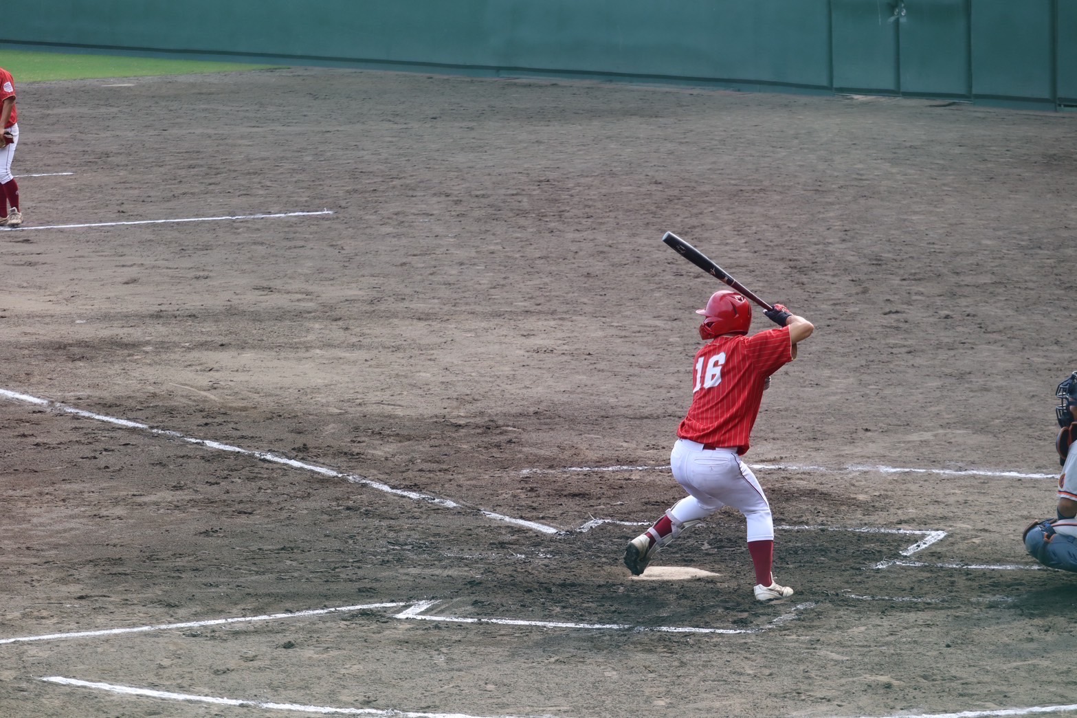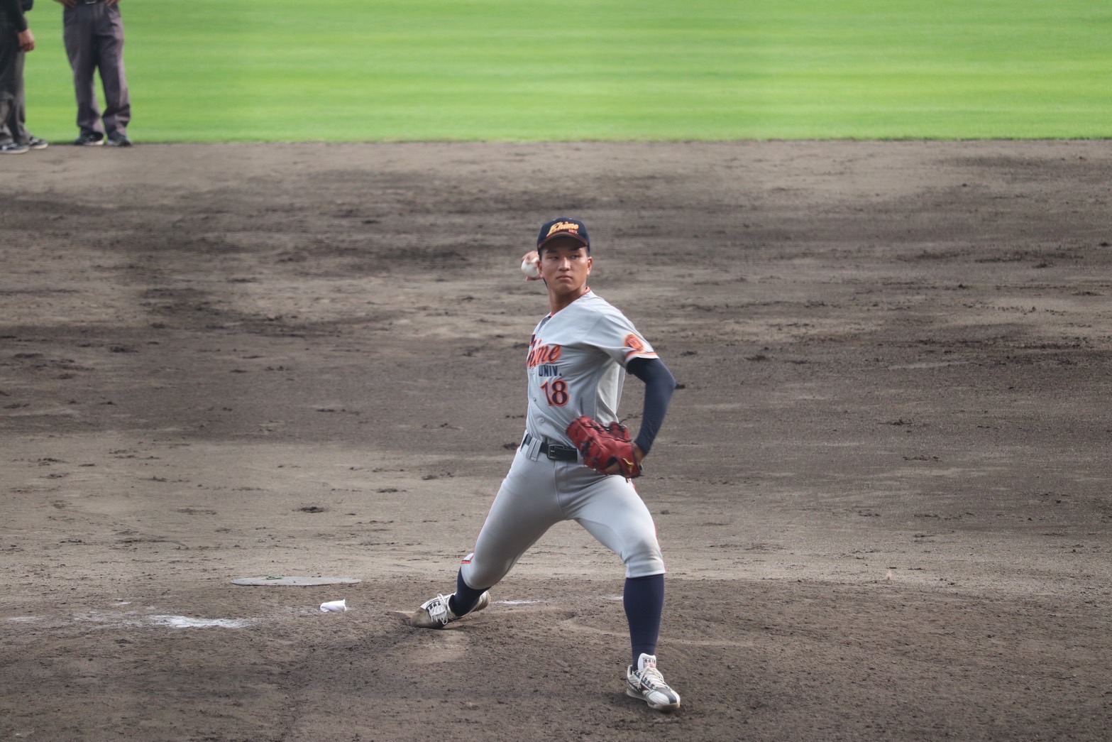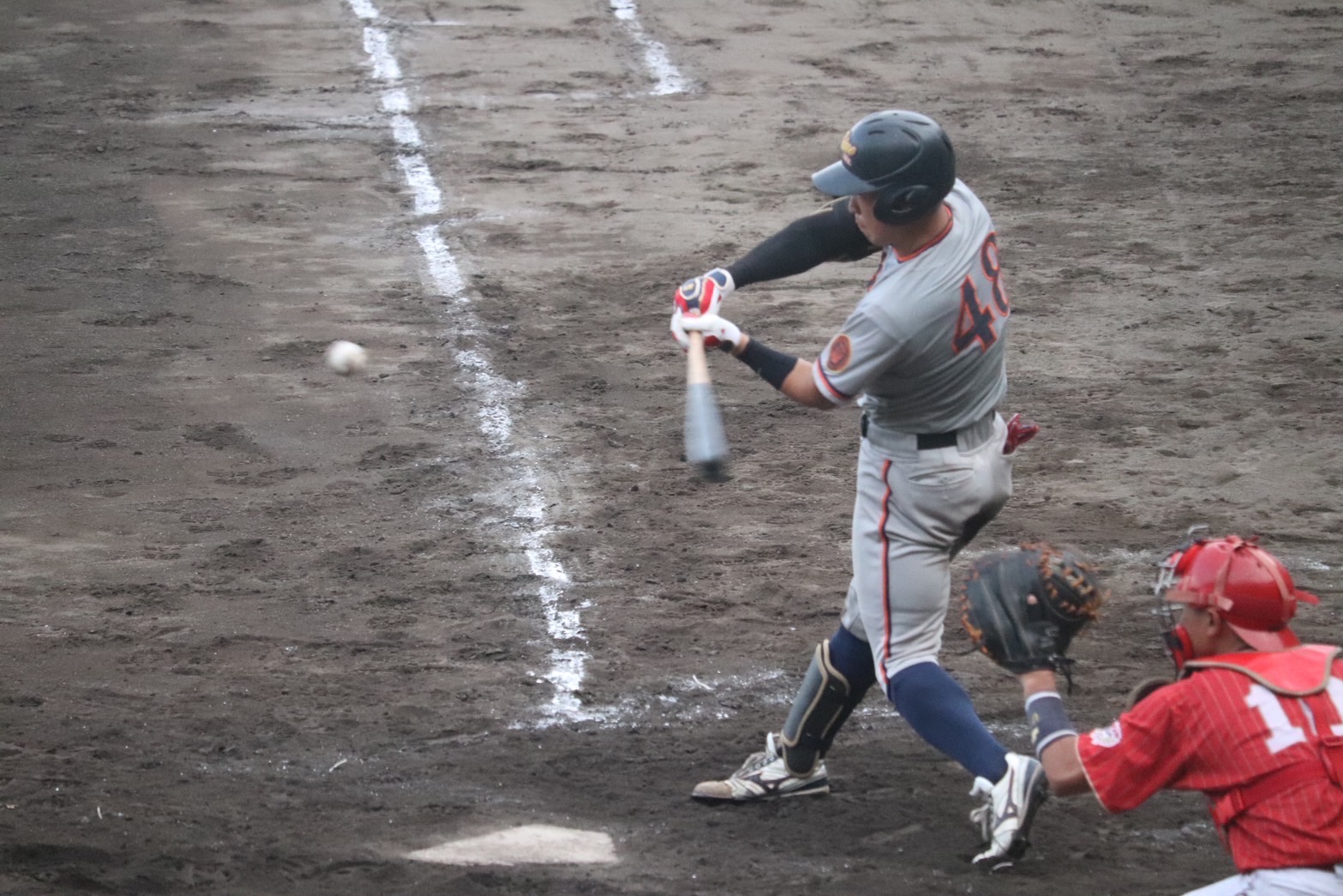 愛媛大と四学大の第2回戦は、昨日の投手戦とは打って変わって乱打戦となった。愛媛大は初回、塚本(2年:武田)、太田(2年:松山北)が連打でチャンスを作ると、4番米山(4年:伊那北)のタイムリーヒットで先制点をあげる。しかしその裏、四学大は死球でランナーを出すと島袋(2年:KBC学園未来沖縄)がレフトへのツーランホームランを放ち逆転に成功する。続く2回にも先頭の桃原(2年:コザ)が安打で出塁すると、ショートゴロの間に追加点をあげる。負けじと愛媛大も、3回に四球でランナーを出すと、臼井(4年:祇園北)がタイムリーヒットを放ち、4回には相手の守備が乱れる間にすぐに同点に追いつく。また、5回には安打でランナーを溜めると、またも4番米山が走者一掃となるタイムリースリーベースヒット、続く奥信(3年:盈進)もタイムリーヒットを放ち一挙3得点で勝ち越しに成功する。愛媛大は7回、8回にも追加点をあげ、四学大を一気に引き離す。何としても逆転したい四学大だったが、愛媛大の2番手中尾(2年:松山東)を前に3回からはチャンスを作れずゲームセット。愛媛大が大量得点で勝利し2連勝で勝点を獲得した。