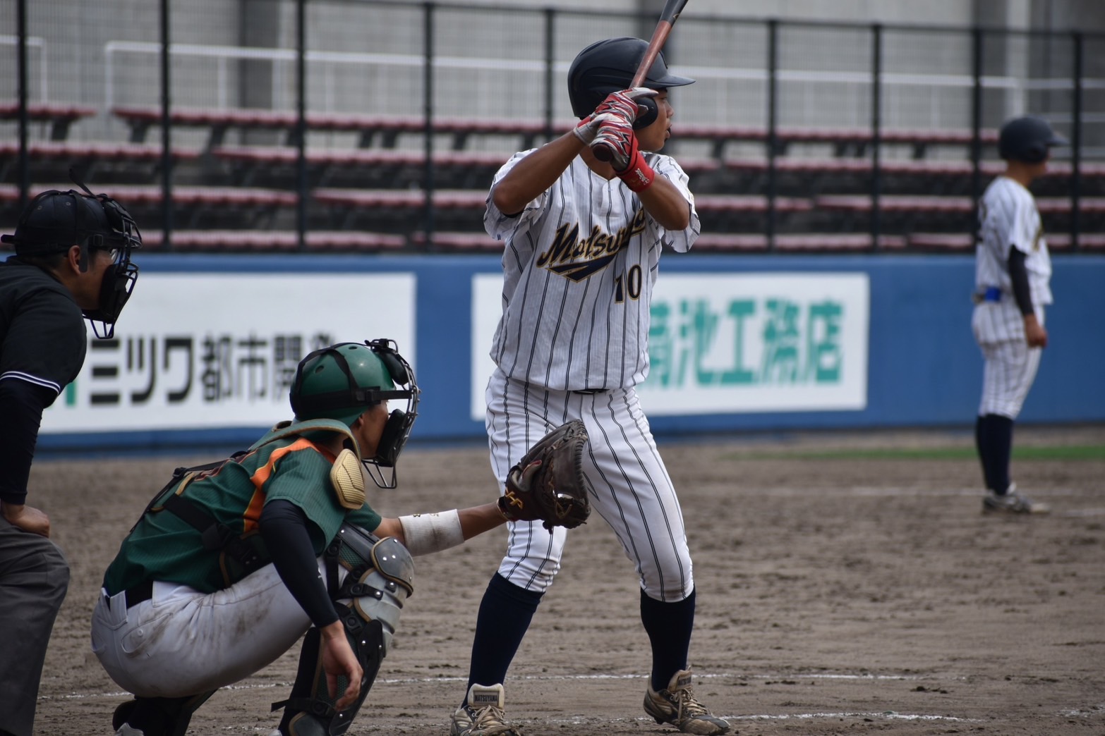 令和7年度秋季リーグ戦第5週目、勝ち点を獲得し上位争いにくい込みたい松山大学と8連勝中の王者・高知工科大学の一戦は、終盤までもつれる接戦となった。松山大先発・秋月(2年:新居浜東)は、2回に5番林(3年:明徳義塾)の左安打、7番田中(3年:亀岡)の二塁打で先制点を許すも、その後粘投し、相手打線に大きな流れを渡さなかった。しかし、高工大も吉賀(2年:大手前高松)を中心とした投手陣が要所を締め、試合は均衡した展開で進んだ。しかし、試合が大きく動いたのは8回。高知工科大学が一時はリードを奪い、2-0で勝利目前に迫ったものの、8回裏に松山大先頭打者3番田丸(3年:広島商業)が中安打で出塁すると、後続の打者もそれに応え、最後は石原(3年:英明)の力でこの回一挙4点を獲得。松山大打線が一気につながりを見せ、集中打で逆転に成功。このまま負けてはいられない高工大も9回表に、2番尾崎(3年:土佐)の二塁打で反撃し、一点を追加するが逆転にはならず。最後まで粘り強く戦い抜いた結果、松山大学が4-3で勝利を収めた。両軍ともに投手陣がよく踏ん張り、守備でも大きな乱れはなかったが、勝負どころでの打線のつながりが勝敗を分けた一戦であった。