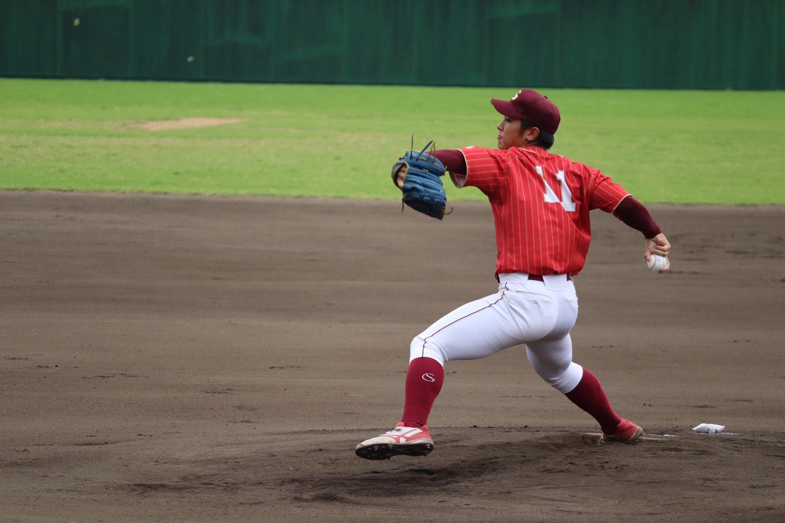 秋季リーグ戦の7週目の第3戦。ここまで2連勝と波に乗る四学大とここまで2連敗中の徳島大との試合。3回徳島大の攻撃、8番西山(2年:柏原)が四球で出塁し、1番畑野(1年:東海大仰星)のレフトへの2ランホームランで先制する。反撃したい四学大は、6回表、1番八田(3年:藤井)がヒットで出塁し、4番永田(帝京第五)の3ベースヒット、5番岡田(高松商業)のレフト前のヒットで2点を追加し同点にする、レフトの送球エラーの隙に打った岡田は3塁に進塁し、尚もチャンスで8番中村(4年:帝京第五)のピッチャー強襲のヒットで逆転に成功する。その後も、ピンチを背負った四学大だが、1点差を守り切り勝利した。