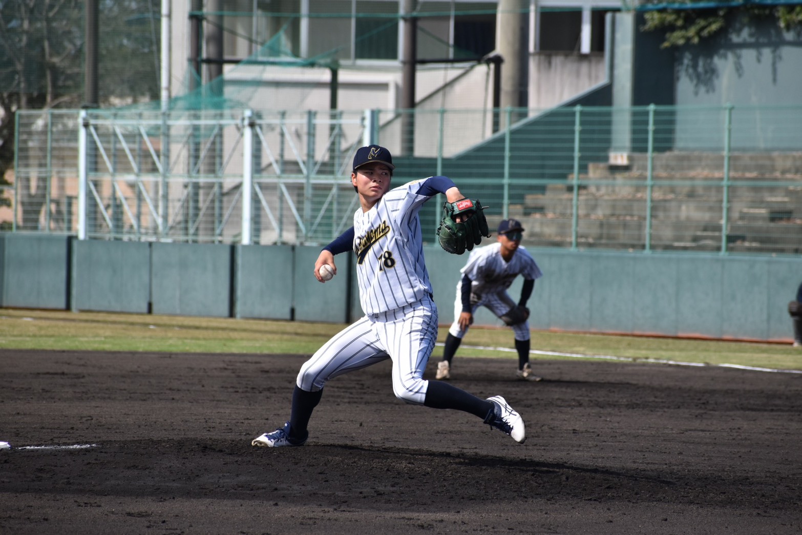 令和8年度春季リーグ戦第1週目、松山大と徳島大の第1試合が行われた。徳島大は先発の神戸(3年:城南)が初回2三振を奪う。しかし松山大は2回裏、大西(2年:松山商業)が右安打で出塁すると、続く篠崎(3年:松山商業)が一発で送りバントを決め、古井の適時打で先制に成功。波に乗った松山大は3回裏、宮内(3年:済美)の適時打で追加点を奪う。さらに5回裏、1番石原(4年:英明)・3番山内(3年:西条)が共に内野安打を決め、着実にランナーを溜めると、そこで宮内が三塁打を放ち、一挙この回3得点を挙げる。このまま負けていられない徳島大は6回表、1番畑野(2年:東海大学付属大阪仰星)が左安打で出塁すると、続く西山(3年:柏原)の二塁打で初得点を獲得。しかし、松山大先発・秋月(3年:新居浜東)が落ち着いた投球で7回1失点で打線を抑え込む。秋月に変わり、8回表から登板の近藤(3年:川之江)も外野フライ等打ち取り、ゼロに抑えた。8回裏、松山大の辻(1年:徳島城東)と山口裕生(1年:英明)の1年生コンビが適時打を放つ活躍を見せ、追加点。その後も徳島大は反撃及ばす、松山大が7-1で勝利を収めた。